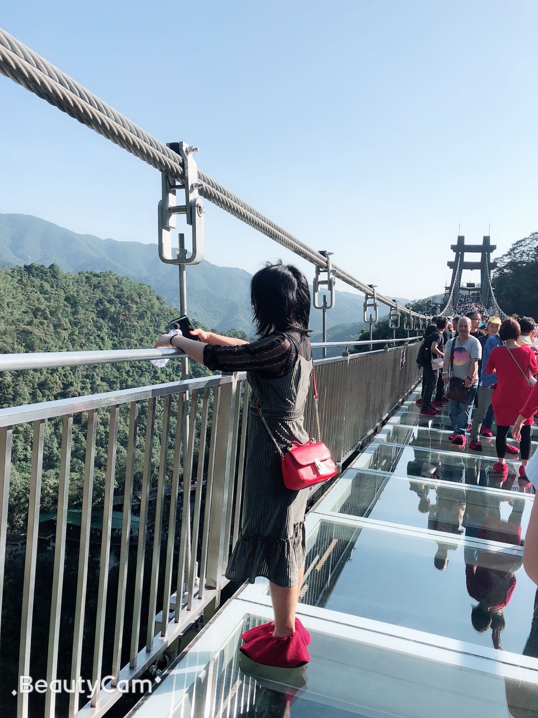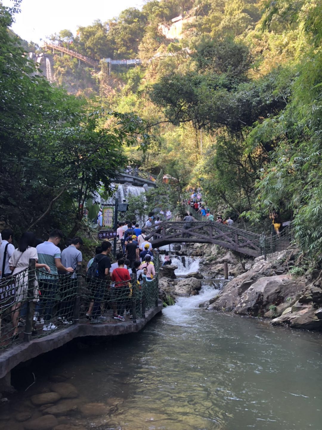 午飯過后,大家繼續趕往下一景點——古龍峽,早已聽聞古龍峽有一個長達三百多米的玻璃吊橋,想著馬上就能一睹風光,心里真是又激動又害怕。從山下一路上來,來往的人真是數不勝數,雖然一路走走停停,但正好可以享受沿途的風景。一路上拍照留念,很快并到達玻璃橋的入口,看著橋面上熙熙攘攘的人群,內心也不會感覺到那么害怕了;站在橋面上,微風拂面,真正感受到大自然的美好。