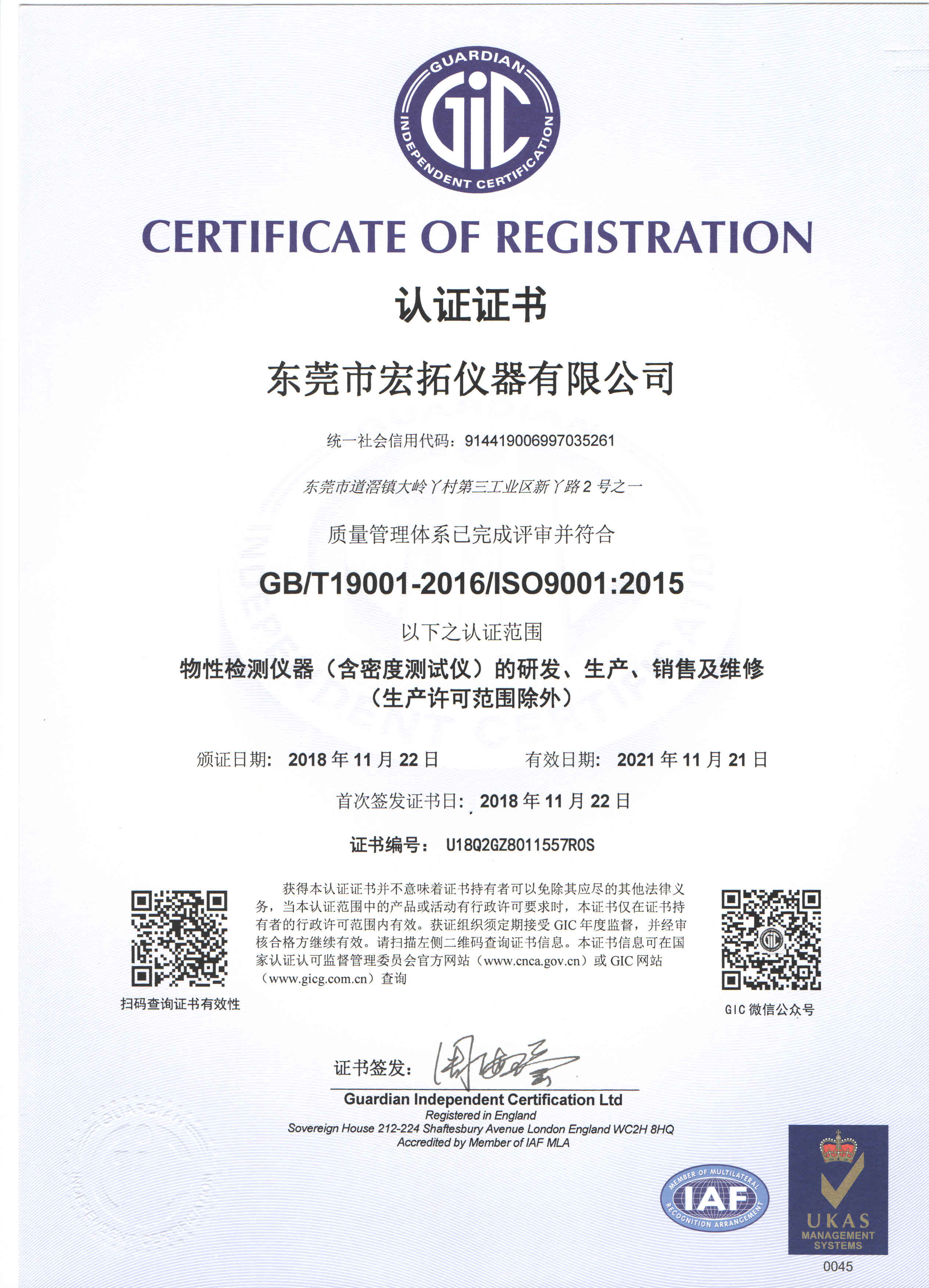ISO9001質量管理體系認證的終審順利通過,證明我司在生產中嚴格把控產品質量,確保每一臺儀器從生產到銷售都讓每一位客戶買的放心,用的安心,對于我們而言,也是儀器市場對宏拓這一品牌的質量認可。同時也證明東莞宏拓儀器將更進一步的成長,為公司的下一步發展做好最重要的鋪墊。
