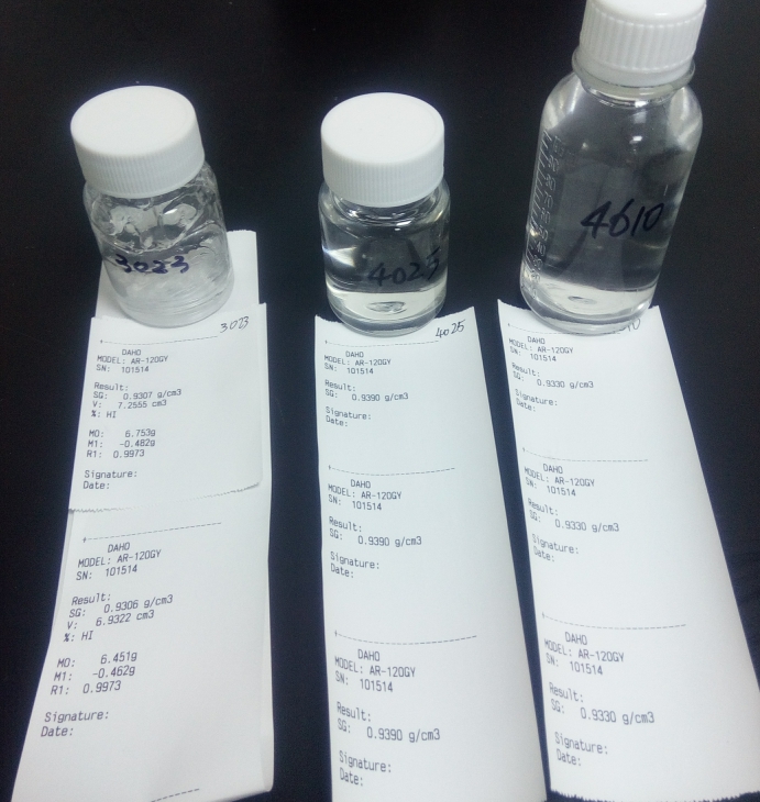 收到客戶寄來的三種樣品,一種是流動性比較大的液體(類似水),另一種是流動性稍微小一點的液體(類似油),還有一種是膏狀物(類似睡眠面膜),三種樣品都呈透明狀,所以有無氣泡一眼就能發(fā)現(xiàn),因為樣品有氣泡的話會影響測試結果,所以最好是能夠消除氣泡再進行測試。好了,下面我們來了解一下如何測試它的密度。